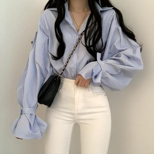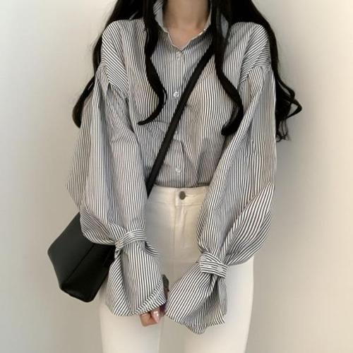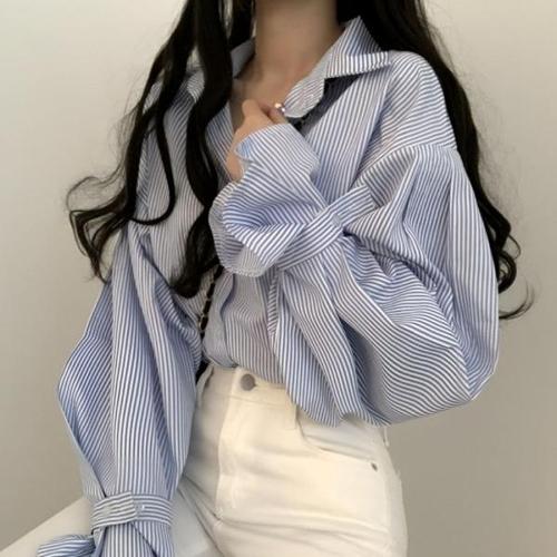 [엄지척]여성 세로 스트라이프 벌룬 소매 오버핏 셔츠_19651510_667501