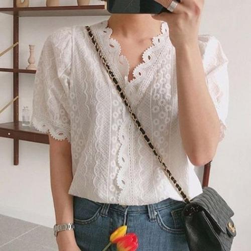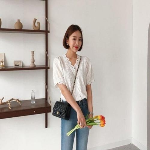 [엄지척]자수 블라우스 벌룬 퍼프 소매 반팔 브이넥 여름 코디_19651438_667501