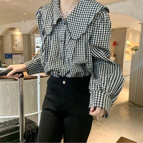 [엄지척]여성 봄 가을 벌룬 소매 라운드넥 단추 체크 블라우스_19650094_667501