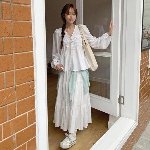 여성 봄 가을 패턴 브이넥 벌룬 긴팔 블라우스 화이트