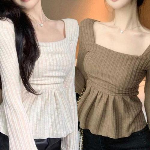 [셀러허브_여성트랜드패션]여성스런 스퀘어넥 프릴밑단 슬림핏 긴팔티 똥배가림