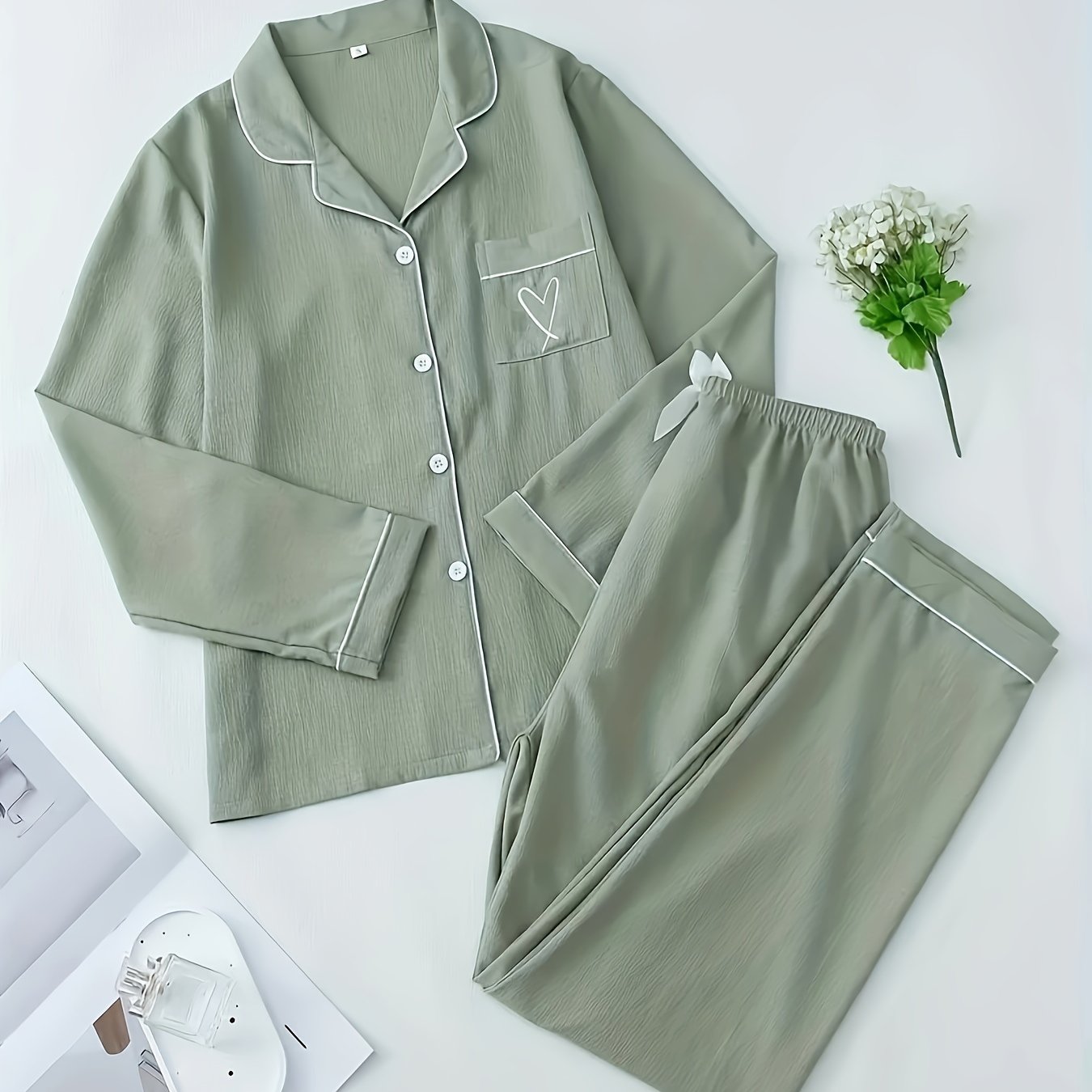 TEMU 외출복으로도 입기 좋은 긴팔 긴바지 파자마 세트. 버블 주름 디자인이 특징이며, 녹색 마치 하트 프린트가 돋보입니다.
