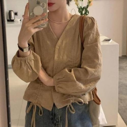 베이지 퍼프소매 블라우스 브이넥 셔링 오피스룩 WFKQ94E