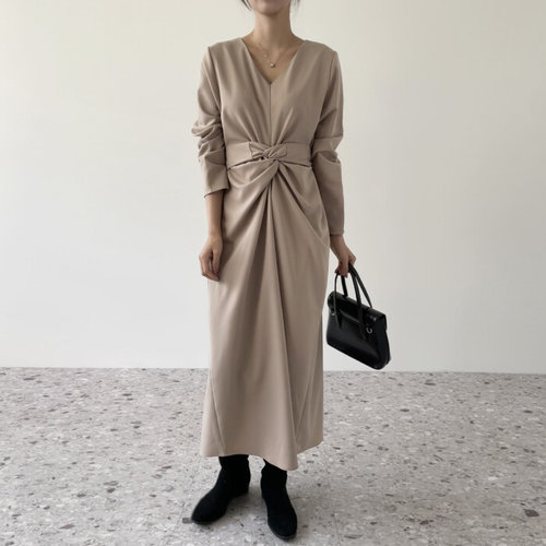 클루이가넷 / 베이지 브이넥 꼬임 롱 원피스