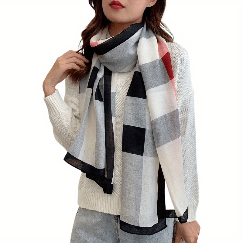 TEMU 여성용 우아한 검은색, 흰색 및 회색 체크 스카프 - 바람과 따뜻함, 폴리에스터 소재, 캐주얼 및 정장적인 기회에 적합한 스타일리시한 액세서리 | 체크 패턴 스카프 | 폴리에스터 소재, 스카프