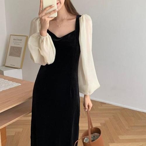 [엄지척]여성 배색 벨벳 시스루소매 데일리 롱원피스_19860961_667501