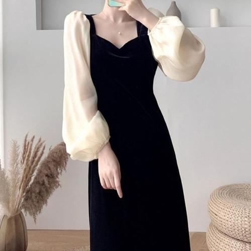 [엄지척]미디 롱원피스 여성 시스루소매 봄 벨벳 원피스 가을_19869826_667501