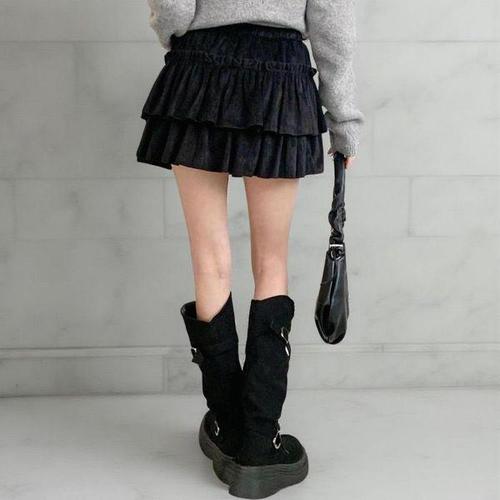 [옷자락] 여성 사랑스러운 두툼한 캉캉 프릴 벨벳 미니 치마