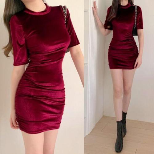 [셀럽하우스]미니 FATQ2064 벨벳 캐주얼 원피스 레드 슬림 셔링 드레스 파티