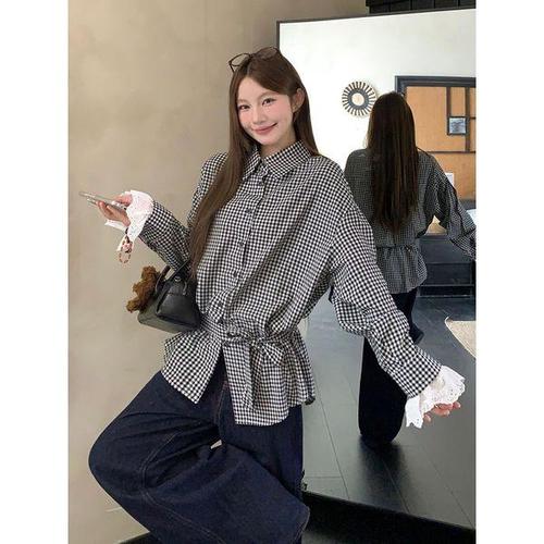 [하젤]나모르 깅엄체크 레이스 벨트 면셔츠_S4617