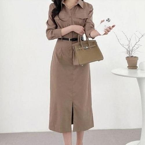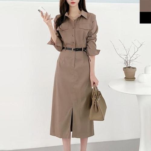 [다잇템][다잇템] 여자 남방 가을하객룩 카라넥 오피스룩 혁대 롱원피스_23387755_588872