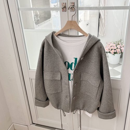 [샵앤] 콩지 빅포켓 여성 단추오픈 밑단셔링 루즈핏 니트 후드 긴팔 가디건 점퍼 BONG-WCD-2870-그레이