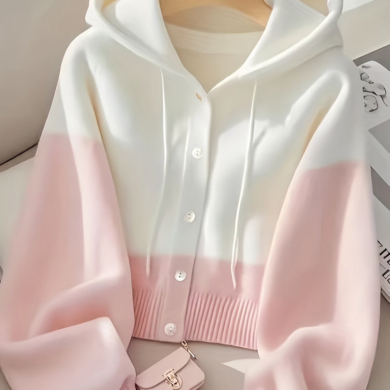 TEMU 여성용 소프트 핑크 & 컬러 블록 후드 가디건 - 캐주얼 루즈핏 오픈 프론트 스웨터, 버튼 디테일, 봄/가을용 올 시즌 레이어링 아이템|가디건