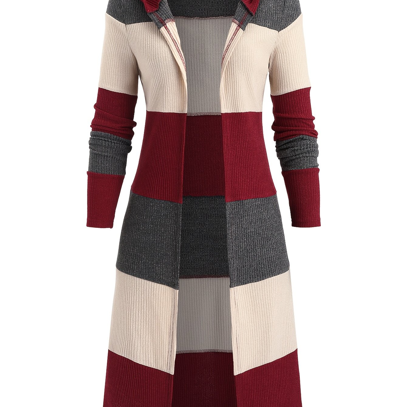 TEMU 여성용 캐주얼 후드 긴팔 가디건 - 마룬 & 컬러블록 디자인, 세탁기 사용 가능한 가을 겨울 따뜻한 코트 전면 포켓, 시즌 패션, 편안한 핏, 품질 좋은 스티칭, 가을 옷장