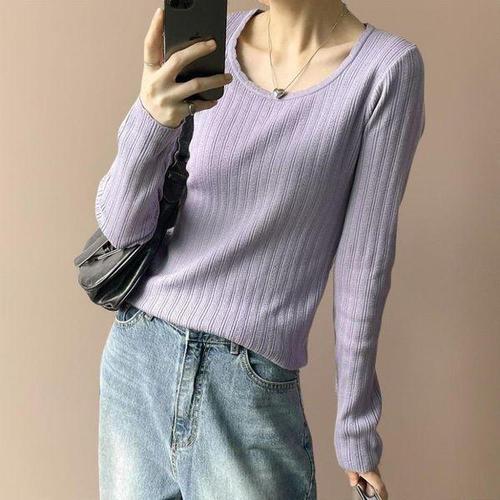 [신상오픈런]여자 파스텔 보라색니트 스카시 골지 스쿱넥 긴팔 니트