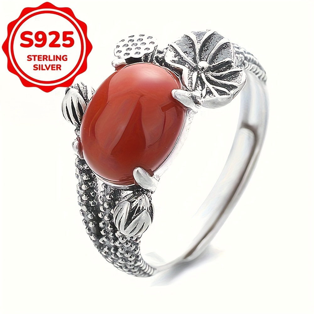 TEMU 1개 S 스털링 실버 빈티지 에이징 매트 연꽃 인레이 가넷 아게이트 에스닉 스타일 여성용 반지, 연회 이벤트용, 무게 약 4.6g, 일상복,레트로 디자인,독특한 반지,스타일리시 액세서리,선물 구매자,액세서리 애호가