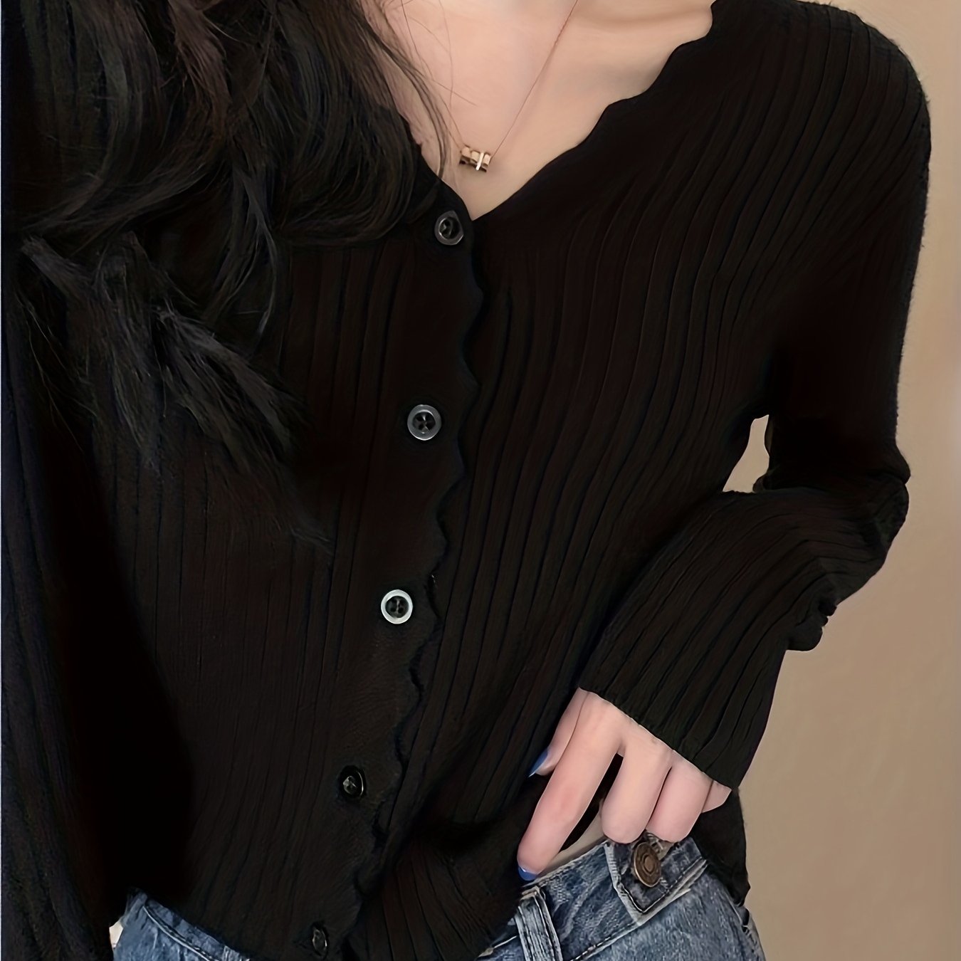 TEMU 2025 신상 가을/겨울 여성 스타일리시 롱 슬리브 가디건, 한국식 V넥 슬림핏 웨이브 밑단 숏 탑코트, 패션 여성 데이트 출근 데일리 멀티아웃어웨어, 한국에서 인기