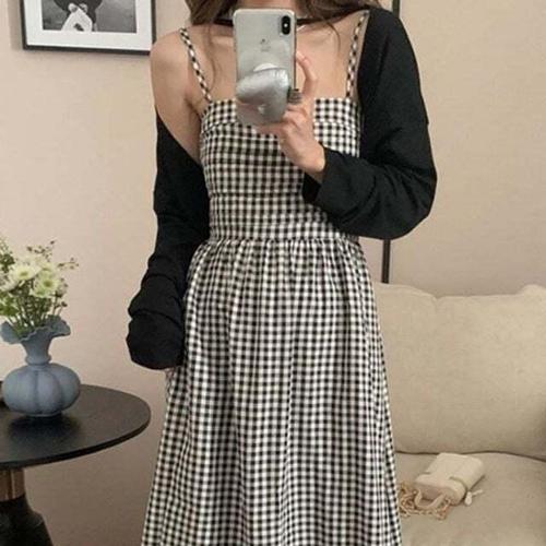 [셀럽하우스]체크무늬 JPEC2874 나시 원피스 볼레로 세트 바캉스룩 휴양지룩