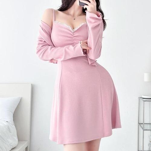 [옷자락]여성 셔링 볼레로 가디건 홀터 미니 원피스