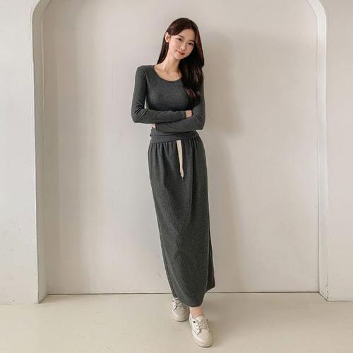 [유야]여성 골지 라운드 긴팔티 H라인 밴딩 롱스커트 세트 -FSST0095- 봄 가을
