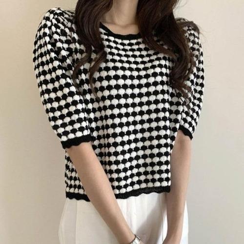 [엄지척]퍼프숄더 배색 니트 티셔츠 봄 여름 코디_19678669_667501