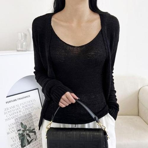 회색 니트 가디건 여성 슬림핏 라운드넥 페이크 투피스 봄 가을 고급스러운 느낌 다용도 긴팔 상의