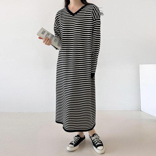 [유야]여성 브이넥 니트 롱 원피스 -FOP0581- 봄 가을