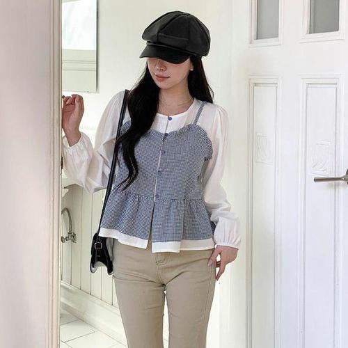 [옷자락] 여자 폴리 페플럼 체크 뷔스티에 레이어드 블라우스