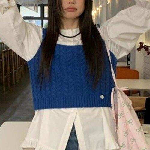 [옷자락] 여성 울혼방 펀칭 리본 크롭 니트 뷔스티에 조끼