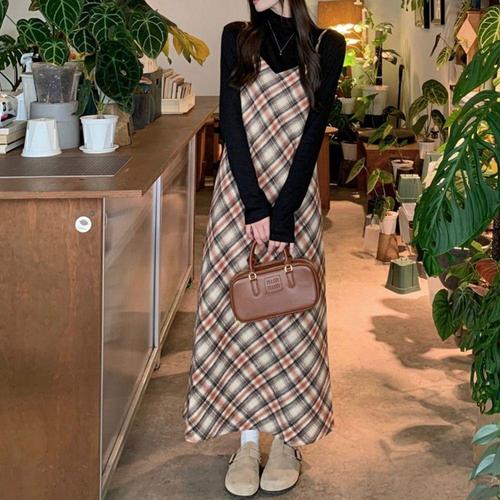 빈티지 체크 모직 레이어드 뷔스티에 원피스 치마 롱원피스 가을 겨울 긴팔 여성 루즈