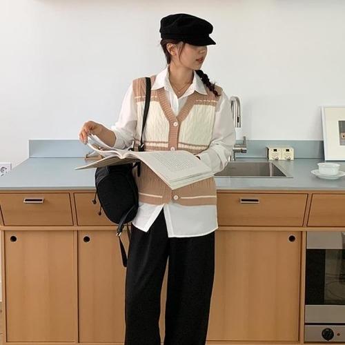 [신상오픈런]|CHD20FB|여자 심플 무지 셔츠 브이넥 배색 조끼 세트_18642990_597559
