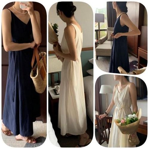 [엄지척]V넥 여성 허리 스트랩 패미닌 끈나시 롱원피스_19911159_667501