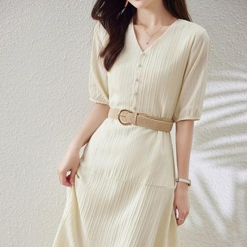 [다잇템]여자 브이넥 린넨 캉캉 셔링 여름 반팔 원피스