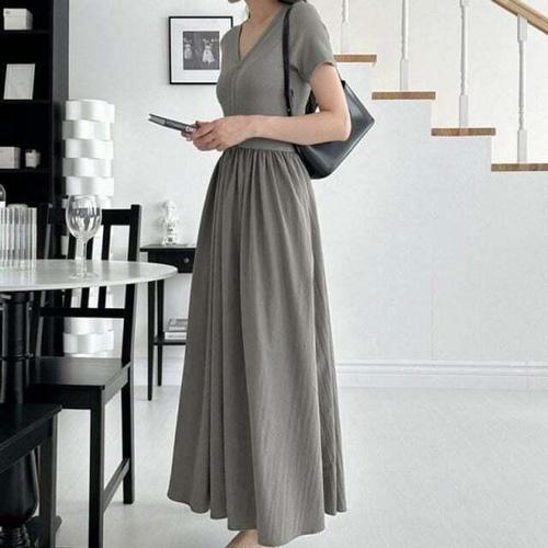 [모노무드]LMO 롱티 미니드레스레이디 하절기 반소매 반팔티 긴기장 블랙컬러 트렌디 브이라인