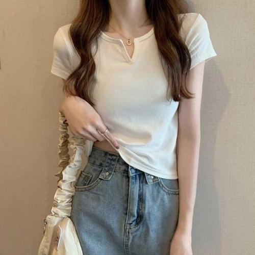[모노무드]LMO 우먼 여름철블라우스 타이트핏 데일리 브이라인 숏탑 반소매 반팔티 바캉스룩
