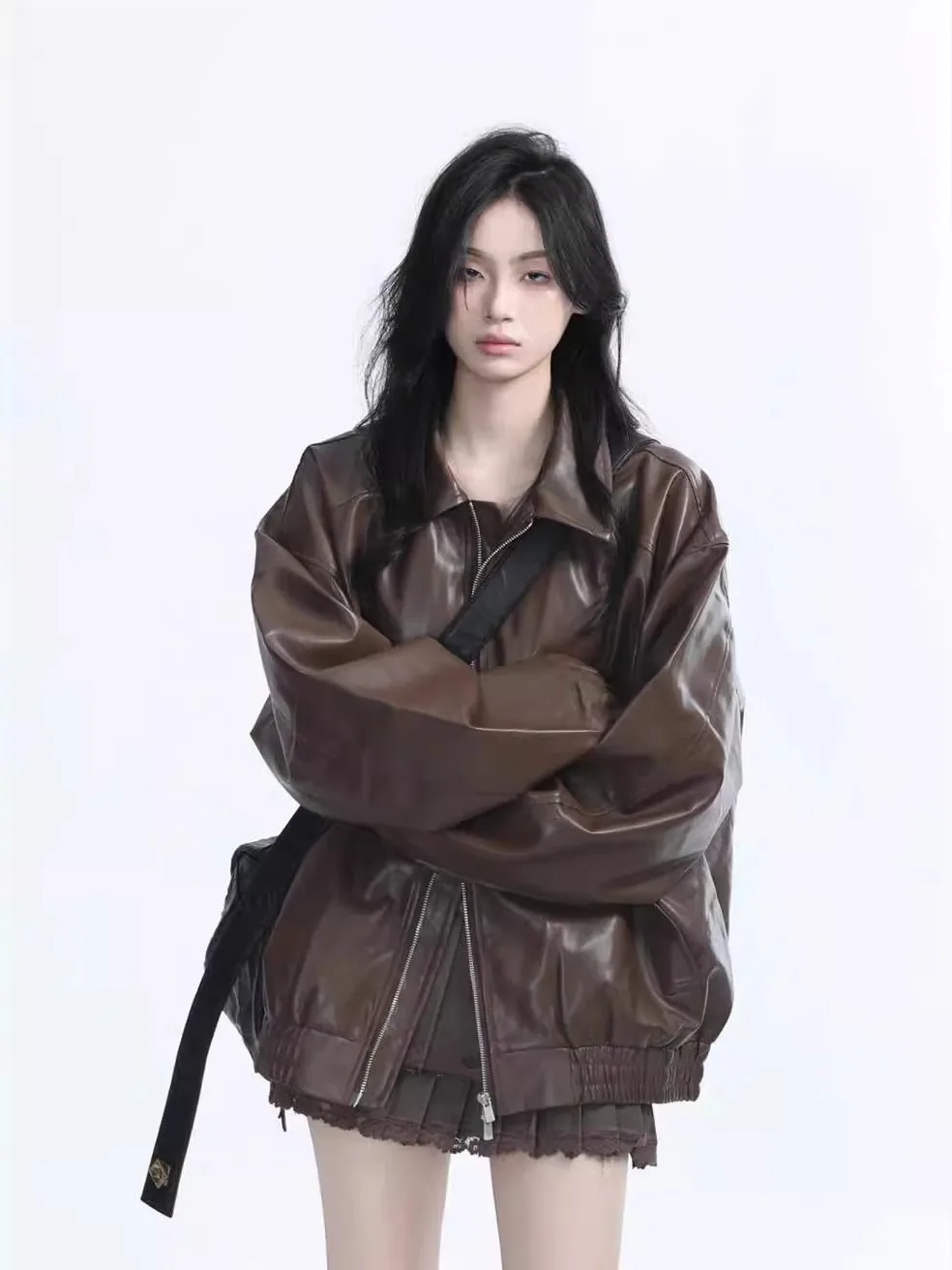 아메리칸 스타일 레트로 블랙 가죽 재킷 여성용 봄 가을 신상 루즈핏 다용도 PU 가죽 바이커 탑 스트리트웨어
