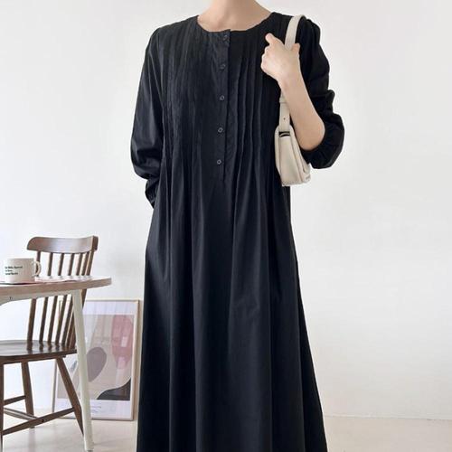 [샵앤][샵앤] 여성 단추오픈 핀턱 면100 간절기 롱원피스 ARA-WDR-4927-블랙