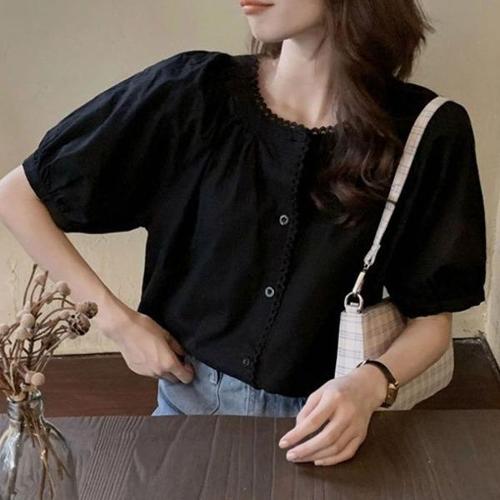 [샵앤]국산 여성 라운드 퍼프소매 면 크롭 반팔 블라우스 MCR-WBL-4682-블랙