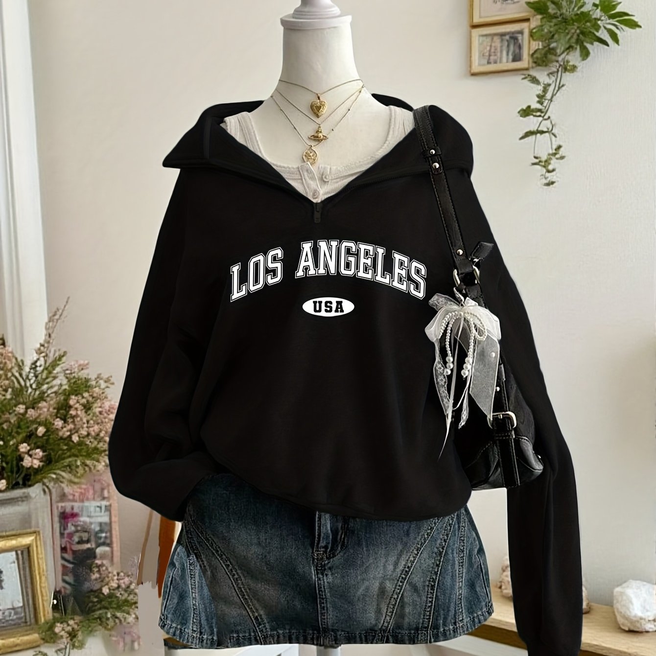 TEMU 로스앤젤레스 레터 프린트 지퍼업 하이넥 스웨트셔츠, 캐주얼 긴소매, 여성 의류