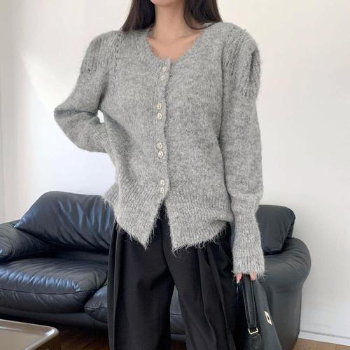 [다잇템]여자 양모 U넥 블링단추 벌룬소매 가디건