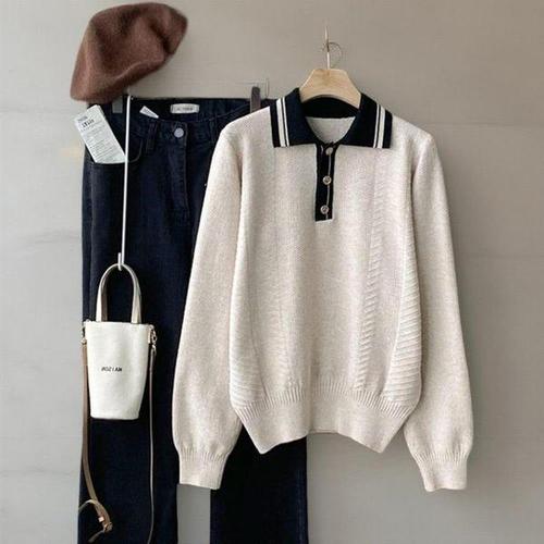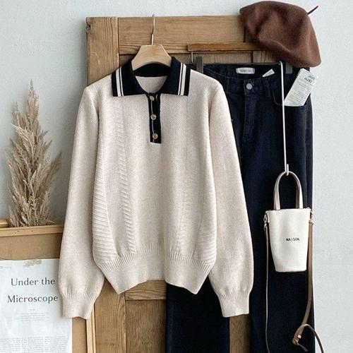 [신상오픈런]여성용 가을 비스코스 배색 카라 니트 스웨터