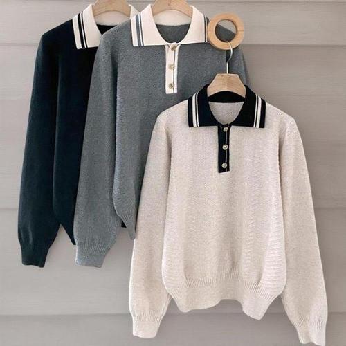[신상오픈런]여성 비스코스 컬러 배색 버튼 카라 니트