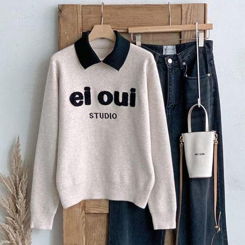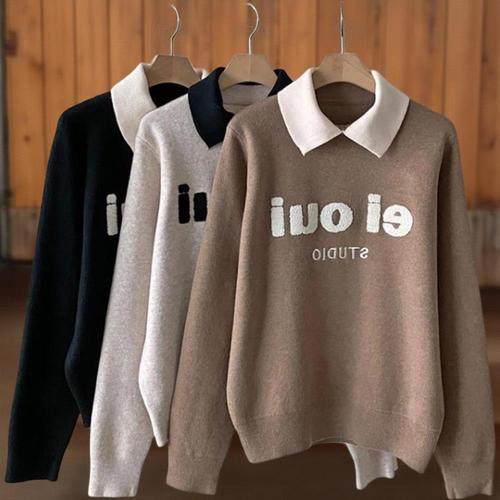 [신상오픈런]여성 가을 비스코스 문자 포인트 배색 카라 니트