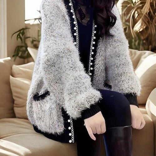 [핑크엘리제]비즈 페미닌 루즈핏 배색 니트 누벨리진주가디건
