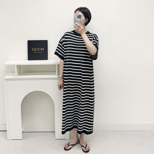 미즈큐즈 / 55-99까지 빅사이즈 스트라이프 반팔 니트 롱 원피