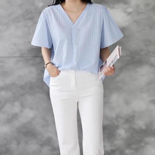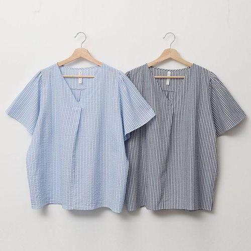 [옷자락]여성 빅사이즈 셔링 반팔 스트라이프 브이넥 블라우스
