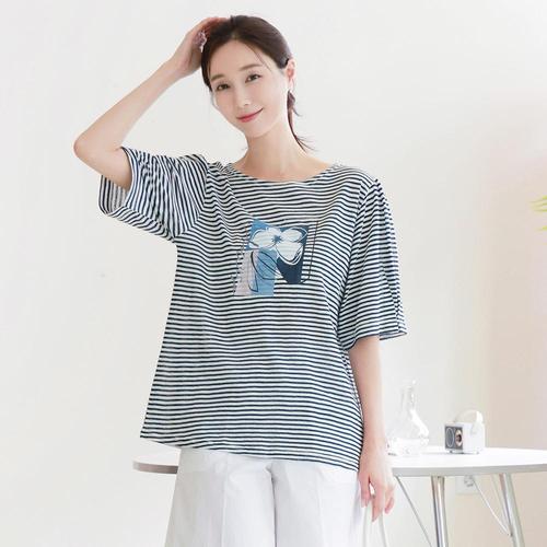 드리다 여성 여름 플라워 프린팅 스트라이프 단가라 빅사이즈 반팔 티셔츠 미시 캐주얼 등원 출근 나들이