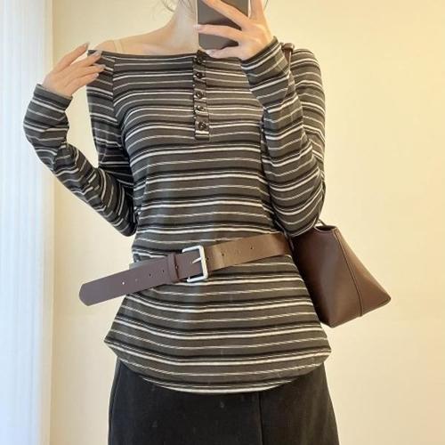 [다잇템][다잇템] 여자 혁대 라글란 볼드숄더 빅사이즈 롱슬리브 단추 티셔츠_23765126_588872