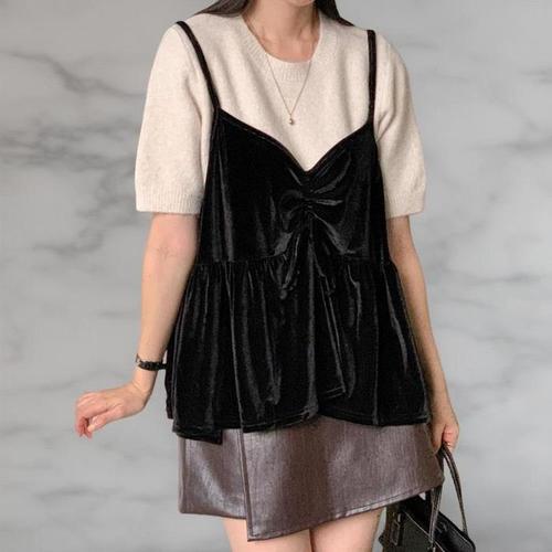 캉캉 프릴 리본 조끼 뷔스티에 블라우스 코듀로이 빅사이즈 골덴조끼 레이어드 벨벳