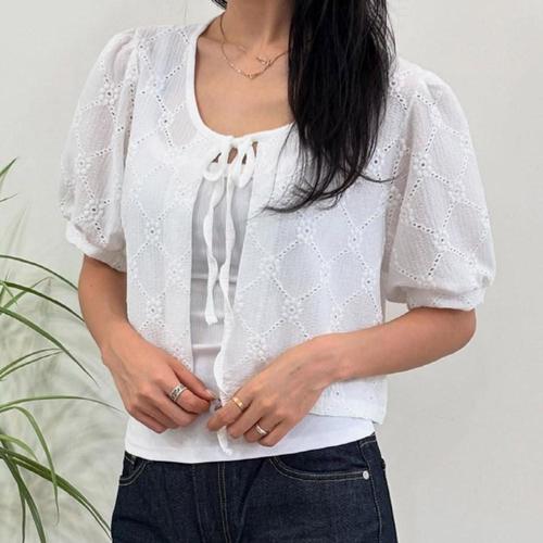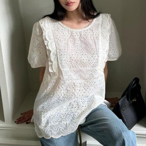 [옷자락] 여자 보헤미안 펀칭 패턴 빅사이즈 퍼프반팔 블라우스